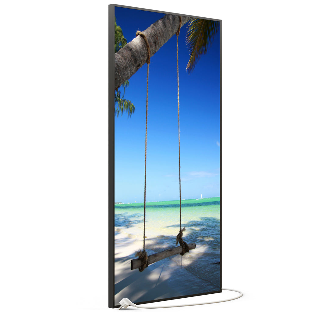 Die 360°-Halterung ermöglicht es, die Bild Infrarotheizung je nach Motiv und Raumgestaltung im Quer- oder Hochformat aufzuhängen. Zudem ist die Montage an Schrägen möglich, was eine besonders flexible und platzsparende Installation ermöglicht.